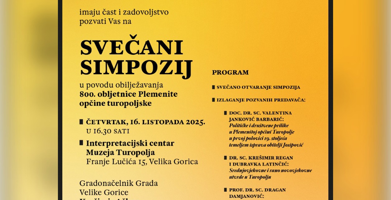 Pozivamo vas na simpozij koji se održava u četvrtak, 16. listopada u 16:30 u Interpretacijskom centru Muzeja Turopolja (Franje Lučića 15, Velika Gorica), objavila je Turistička zajednica Grada Velika Gorica.